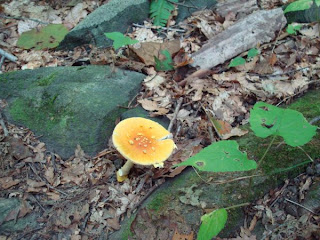 Joan and I met at Trader Joe's parking lot at 8:00 AM this morning. Then we car pooled to the Hilltop parking spot where we would meet up with Rosy and Florence at 8:30 to start our morning hike at the Patapsco Valley State Park again. We started from the Barzard Rock, connected a bit on the Sawmill Branch, cross over the creek to the Charcoal Trail, and found where there are cabins and campers.. From Charcoal trail, we went down the Glen Fire trail, which linked us back to the Tunnel, and looped unto the Barzard Rock trail back to our cars. It was on the Charcoal and the Glen Fire trails that we saw a lot of mushrooms. Some were quite colorful. And we were delighted!